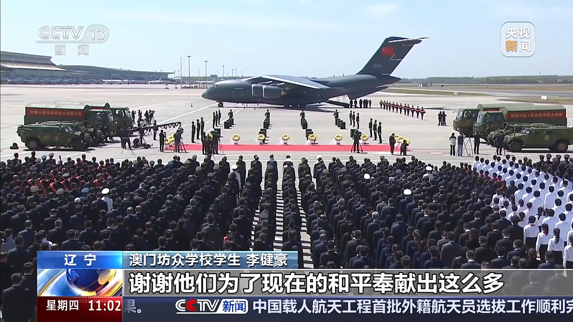 志愿军烈士家属 邓其平:遗骸刚下飞机开始那个仪式,我已经落泪了,他们当年和我的父亲一样,在朝鲜战场上英勇作战。