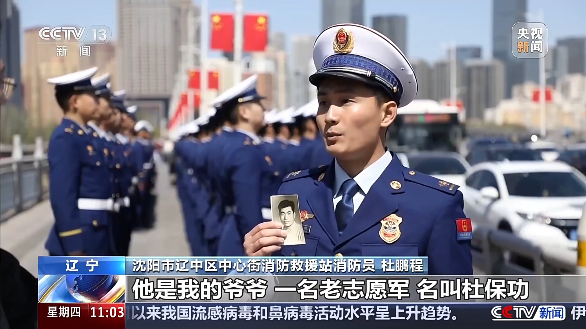 迎回仪式结束后,护送志愿军烈士遗骸的车队从机场缓缓驶出,沿着青年大街向沈阳抗美援朝烈士陵园行进。在这条约30公里的路途中,7万多名群众手持鲜花站满道路两旁,从白发苍苍的志愿军老战士到学生,从整齐列队的消防员到普通市民,人们肃穆静立。今年,沈阳市消防救援局派出130名消防员早早抵达浑河桥,迎接烈士回家。“00后”消防员杜鹏程,小心翼翼地从胸前内兜掏出一张黑白照片。