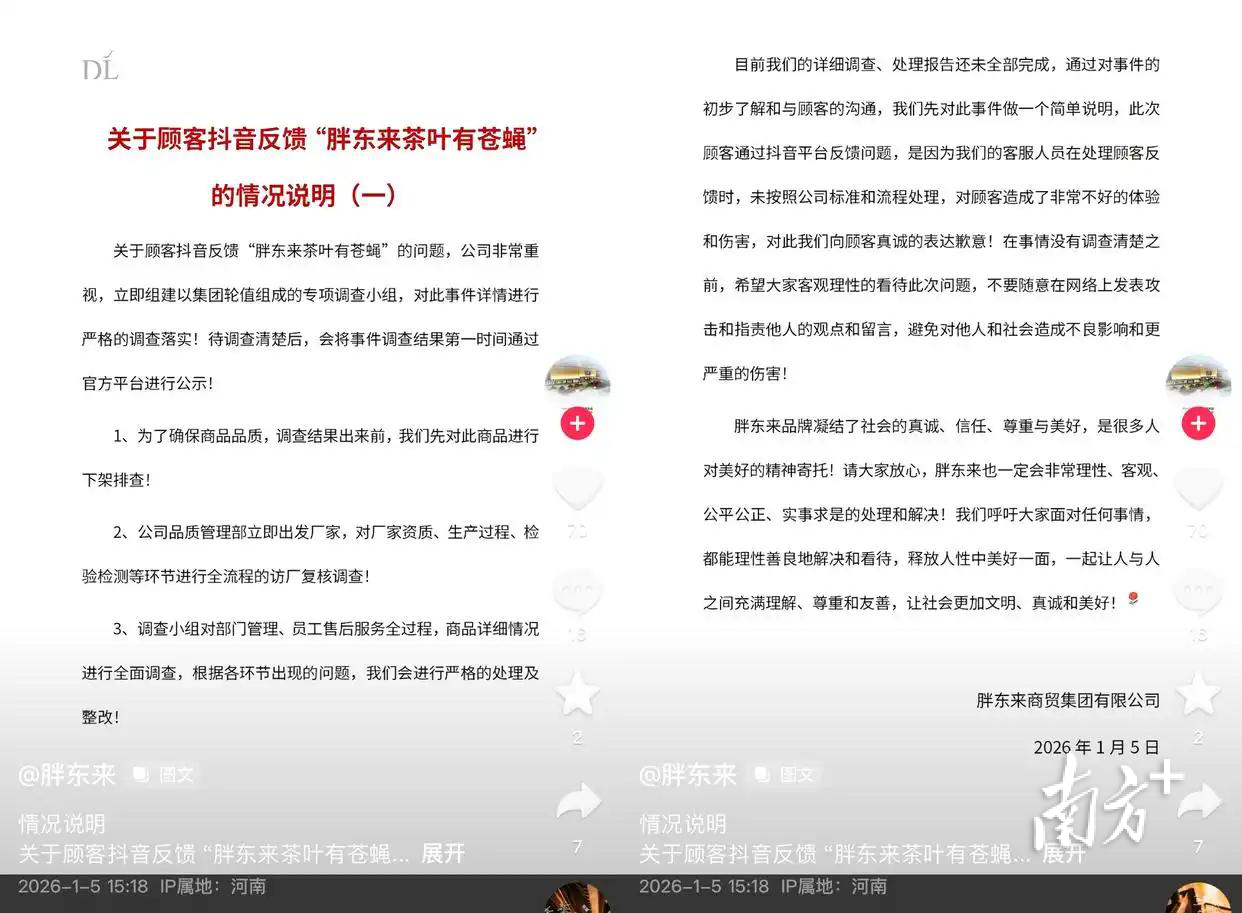 日前14发刚发育就被破了处,有消费者反馈胖东来茶叶包装内出现苍蝇,相关视频发布后迅速引发关注。1月5日,胖东来官方发布情况说明称,立即组建以集团轮值组成的专项调查小组调查落实,对顾客真诚表达歉意,并启动多维度排查整改措施。