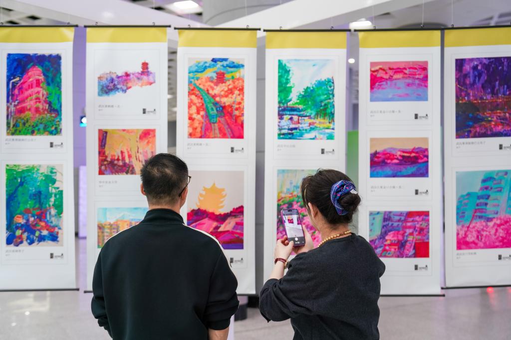 市民在武汉地铁站内观看《城市速写》绘画展。新华社发