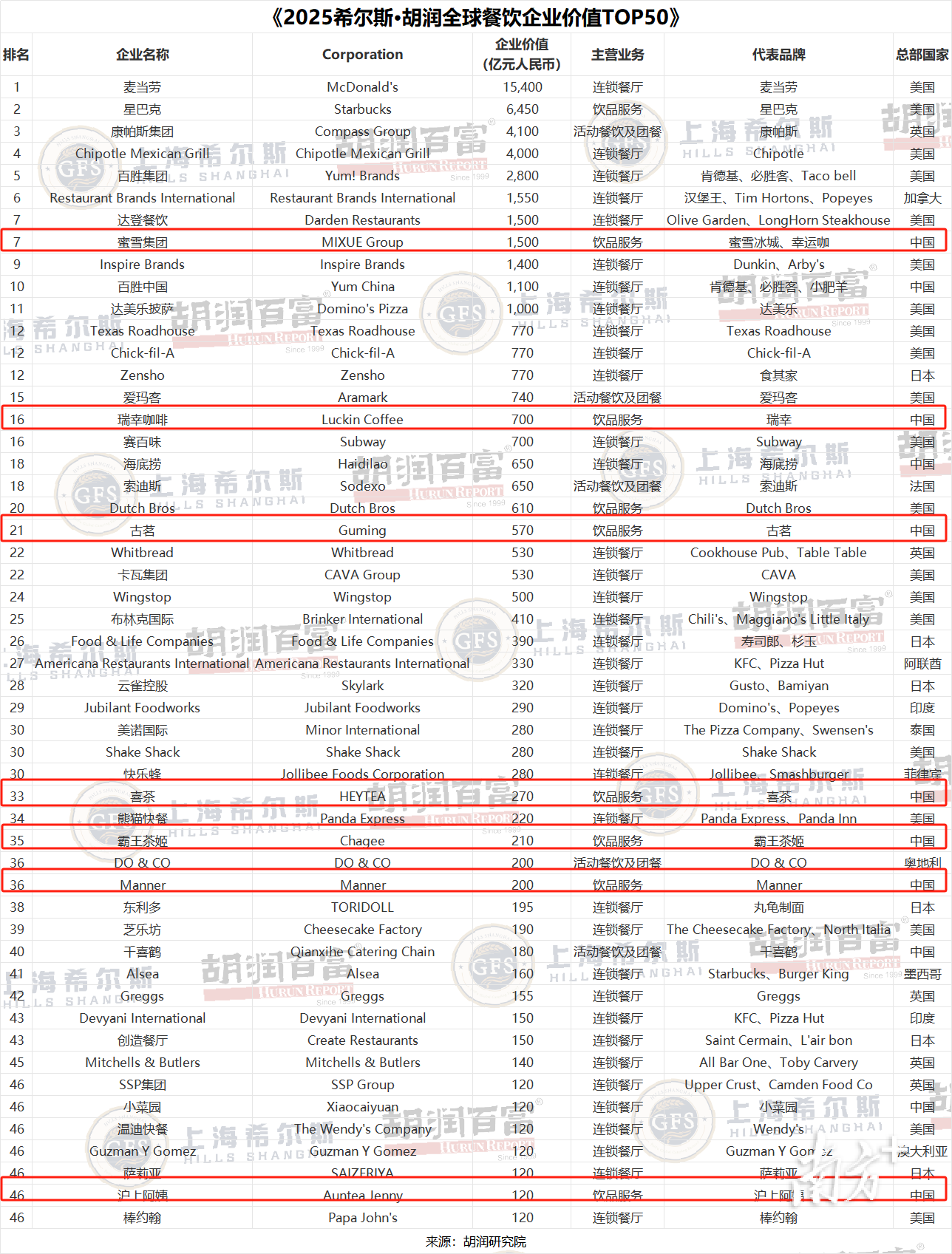 日前,胡润研究院发布《全球餐饮企业价值TOP50》榜单。其中,蜜雪集团以1500亿元价值位列全球第七,同时登顶中国餐饮企业价值榜首。